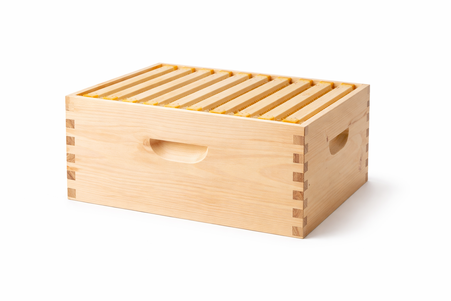 アルプス麓で採蜜された、9枚の巣蜜フレームをそのまま収めた特別仕様のスーパー(巣箱上段)セットです。